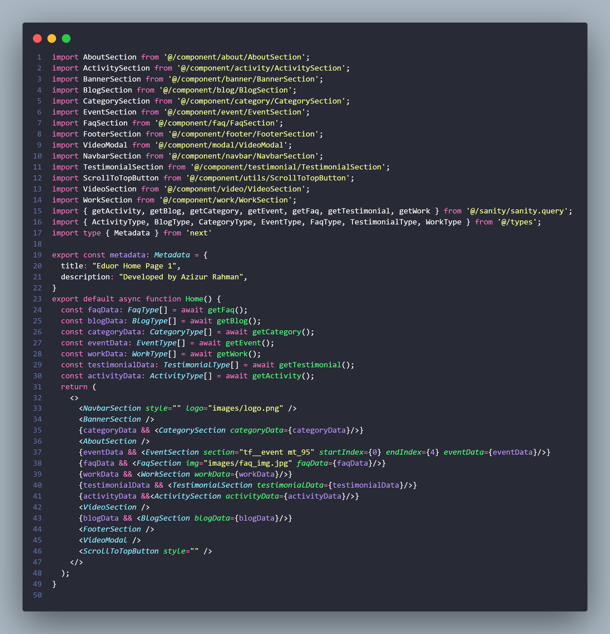 In the index of a page directory we fetch data from sanity. The query is done in sanity.query.ts file of sanity folder. The fetched data is sent to components that require the data by prop drilling.