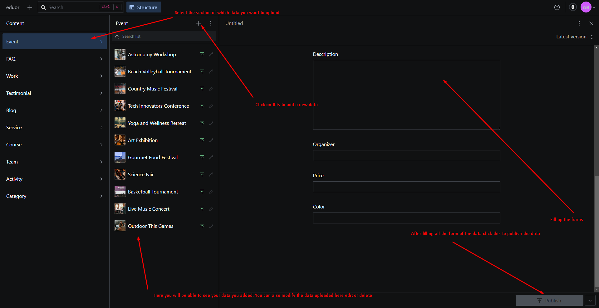 3. To access the database you will need to authenticate with the account you created the sanity account. After authentication you will be redirected to the admin panel where you can upload the data. The schemas are predefined in the schemas folder. If you want you can customize the schemas according to your need in there.