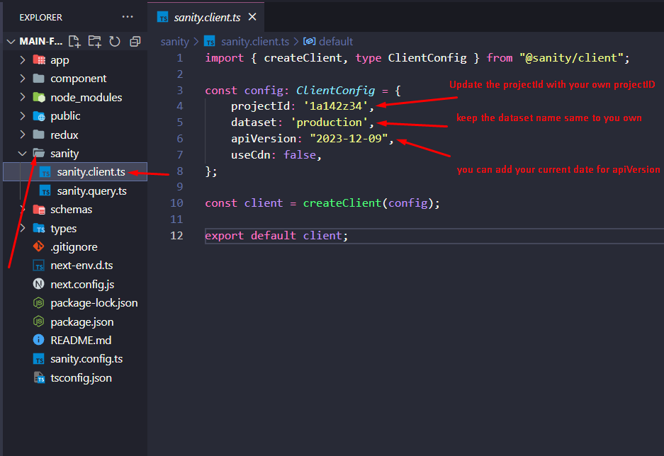 3. We also need to update sanity.client.ts file which is in sanity folder. Just put the projectId and dataset name in that.