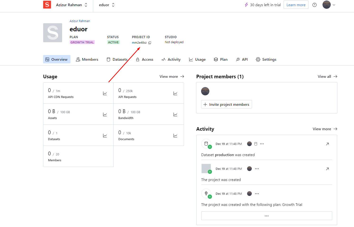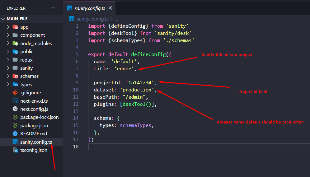 2. There is sanity.config.ts in the root open that in code editor. In the sanity manage page you will see your project id copy that and paste it in the sanity.config.ts projectId field. Also adjust the title and dataset according to your created project configuration in sanity.