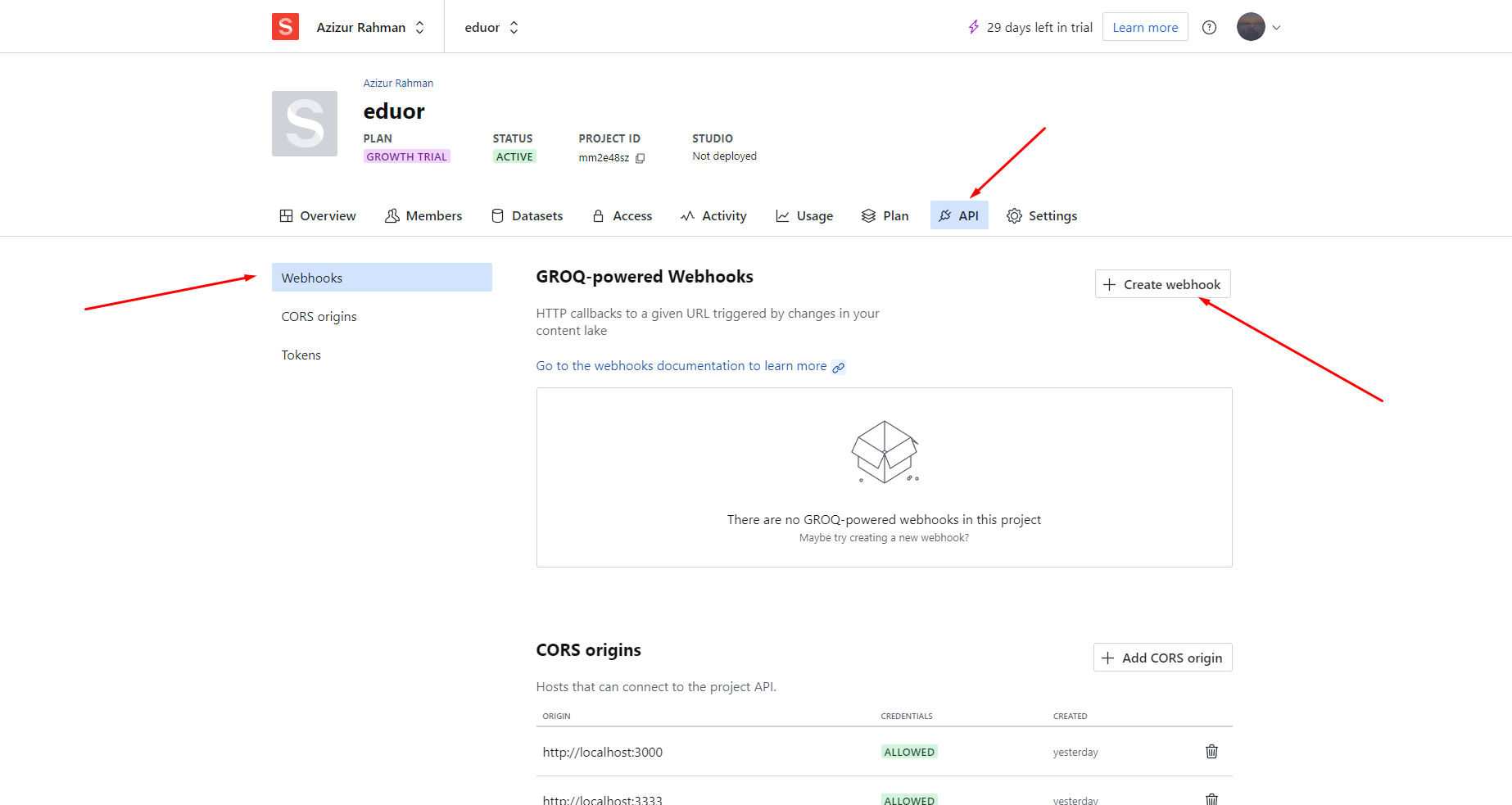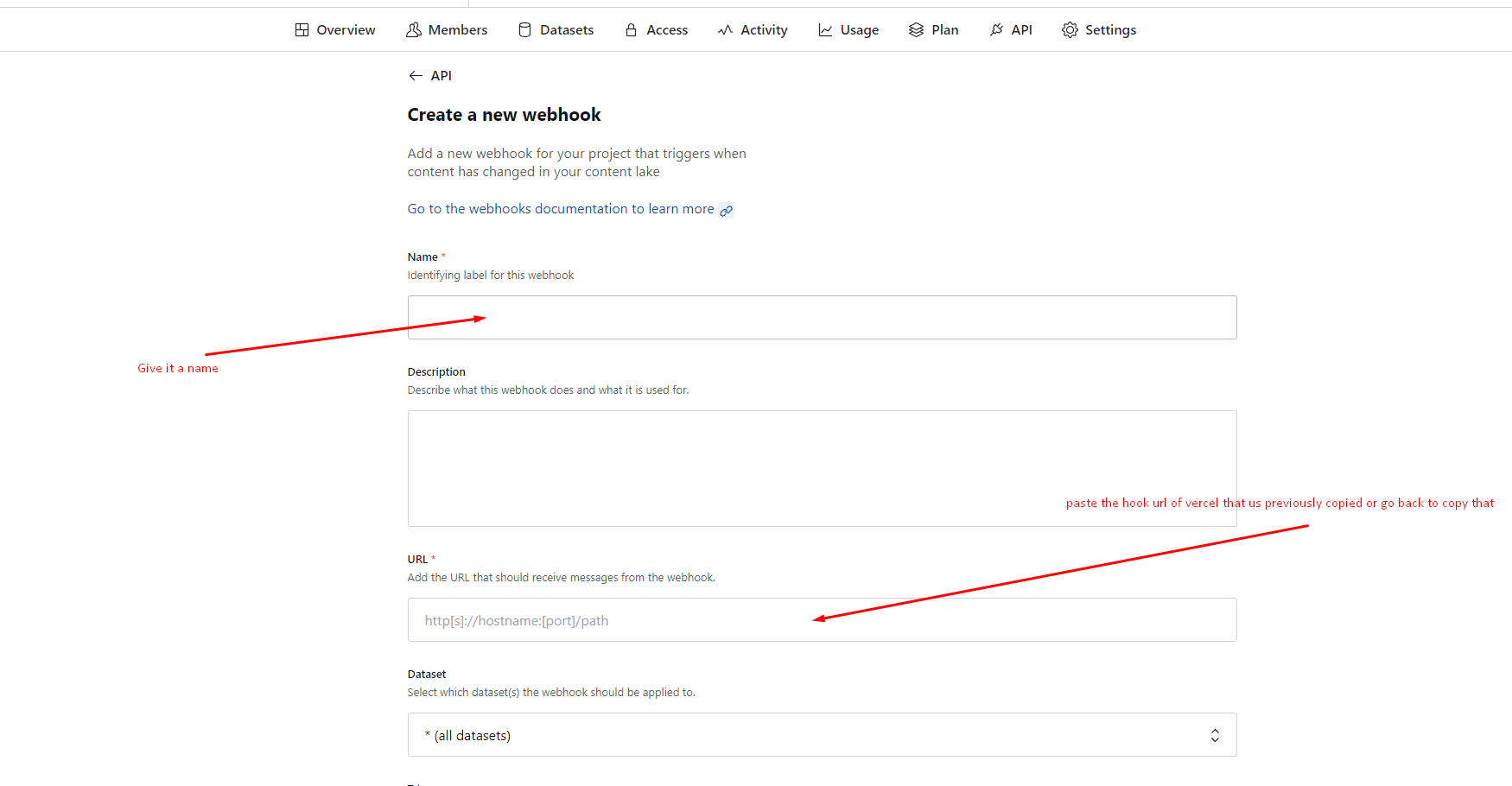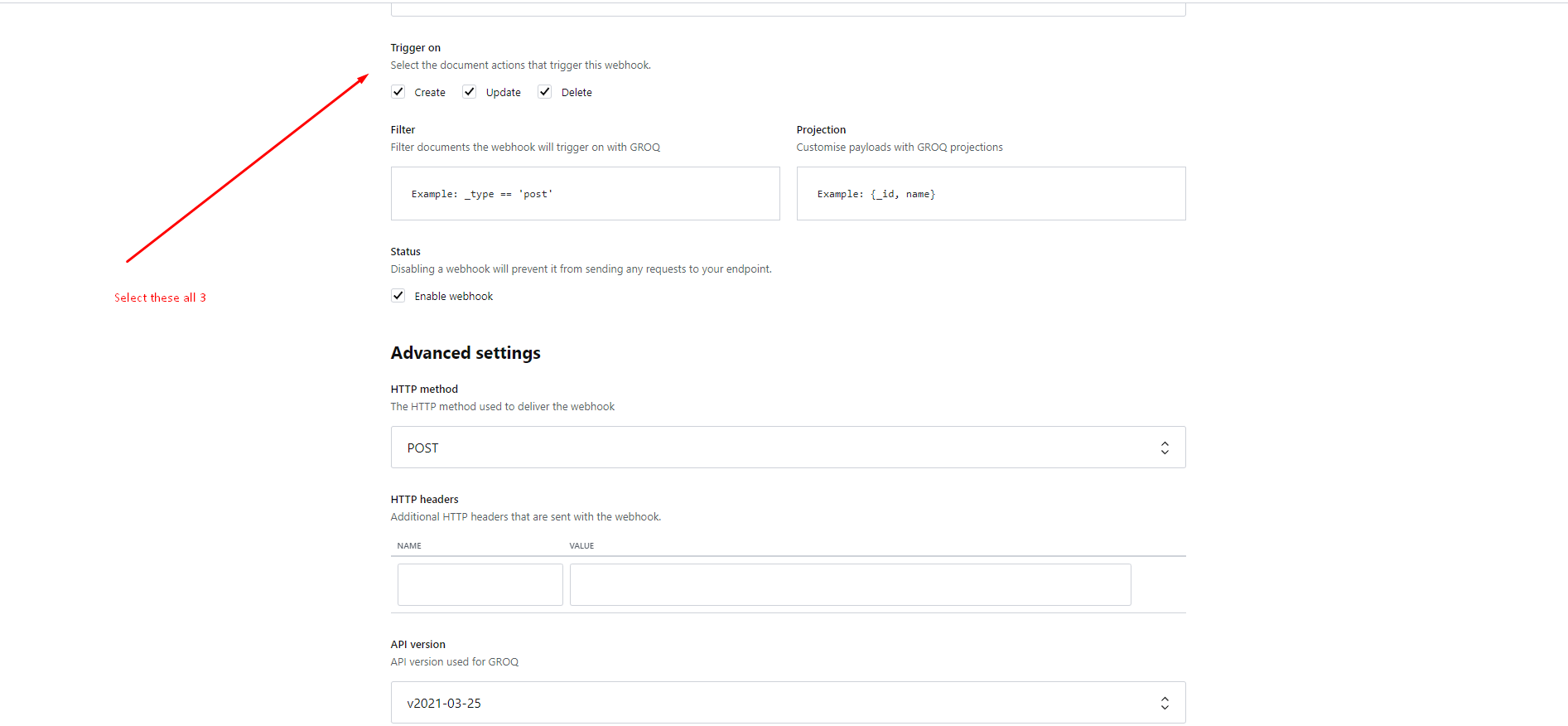 9. Go into your sanity manage panel in the api tab click on create webhook. In that give it a name and fillout the must filled forms and here in the url section paste previous copied url of the vercel deploy hook. And in trigger on section select all three. No advance settings required just save it.