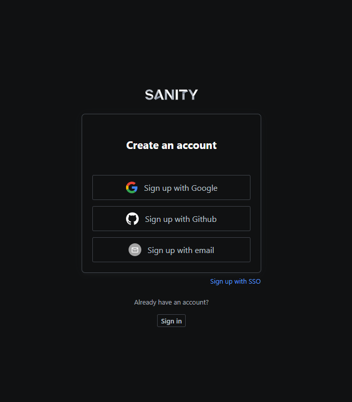 If you don't have a Sanity account, you'll need to create one at https://www.sanity.io/. Create a sanity account with a google account, github or email. You will need this account for getting in the admin panel of the cms and creating a dataset. Sanity provides a single free dataset if you want to upgrade you can checkout their pricing.