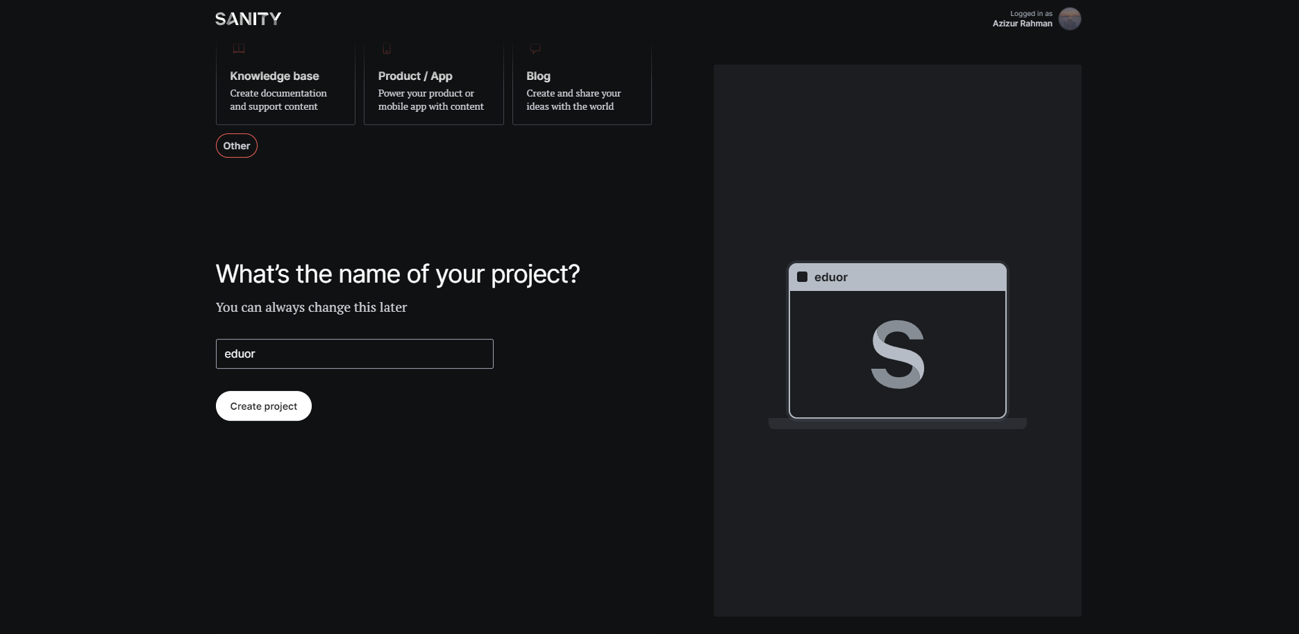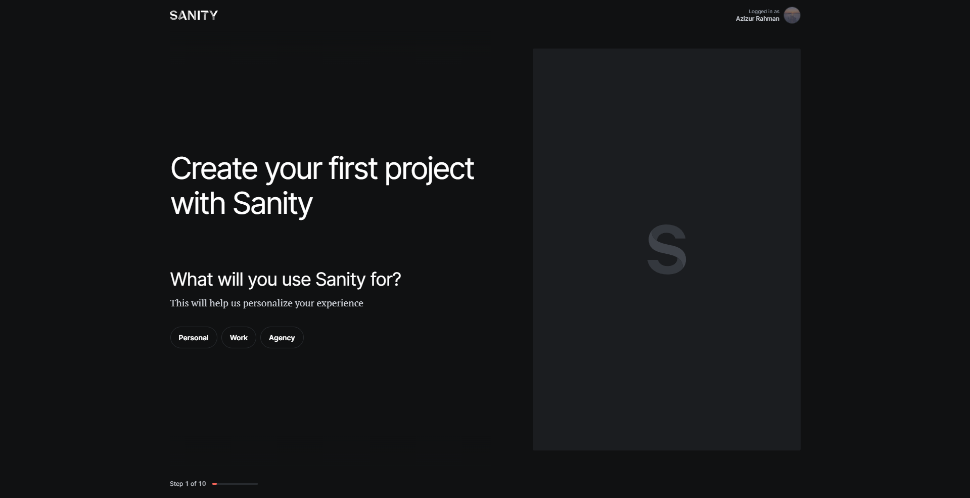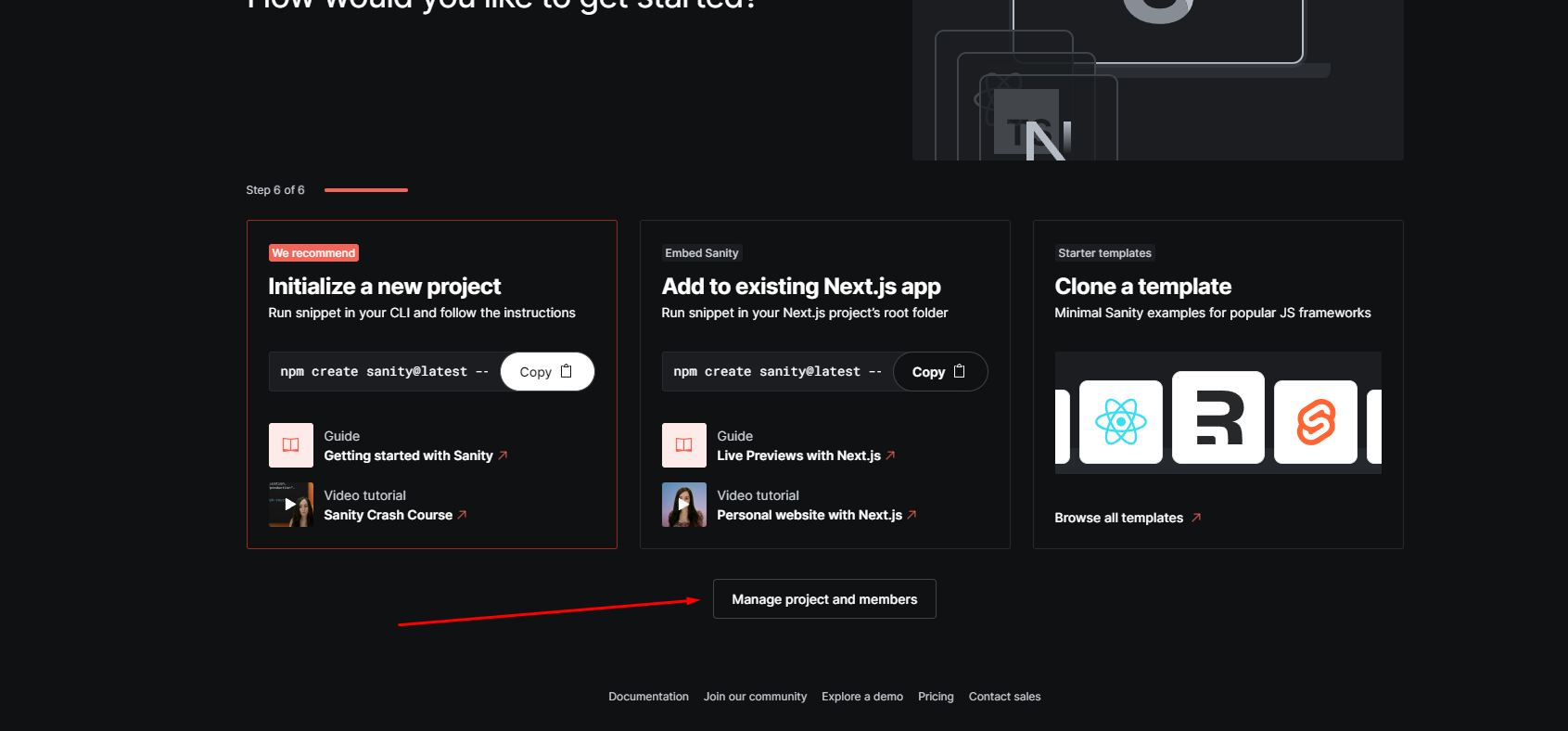2. After creating a profile you will be redirected to a landing page where you will select some information and at the end give a name to your project and when the section comes to select or build a new project just go to manage section of sanity.