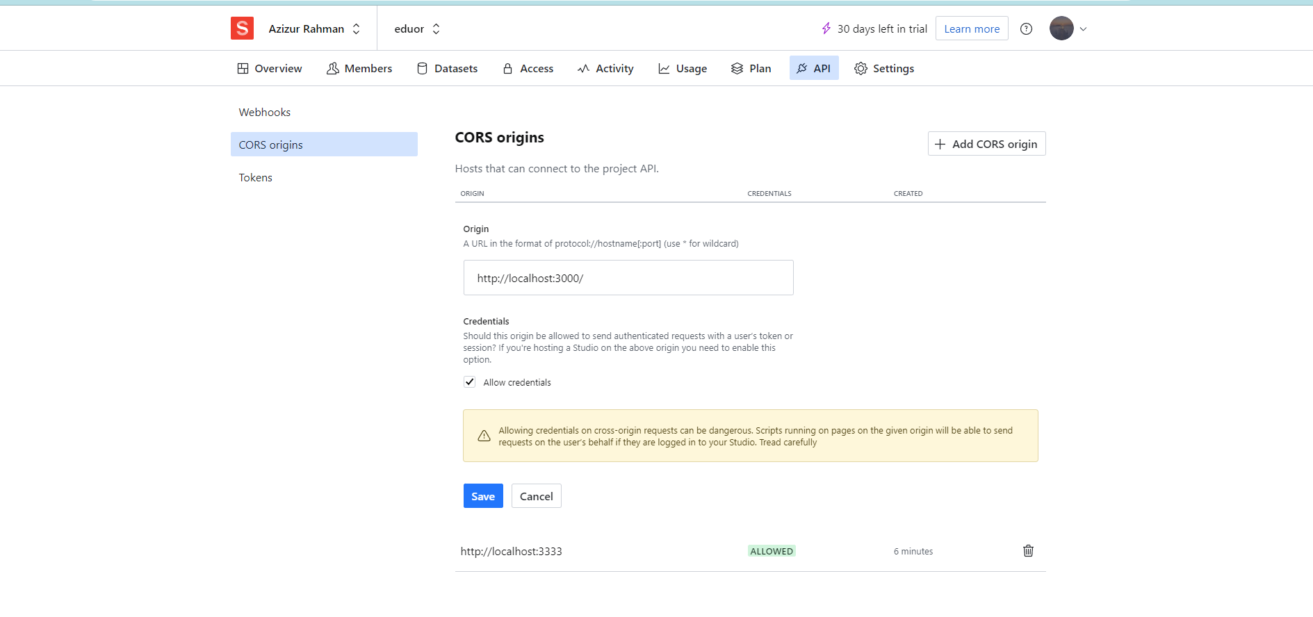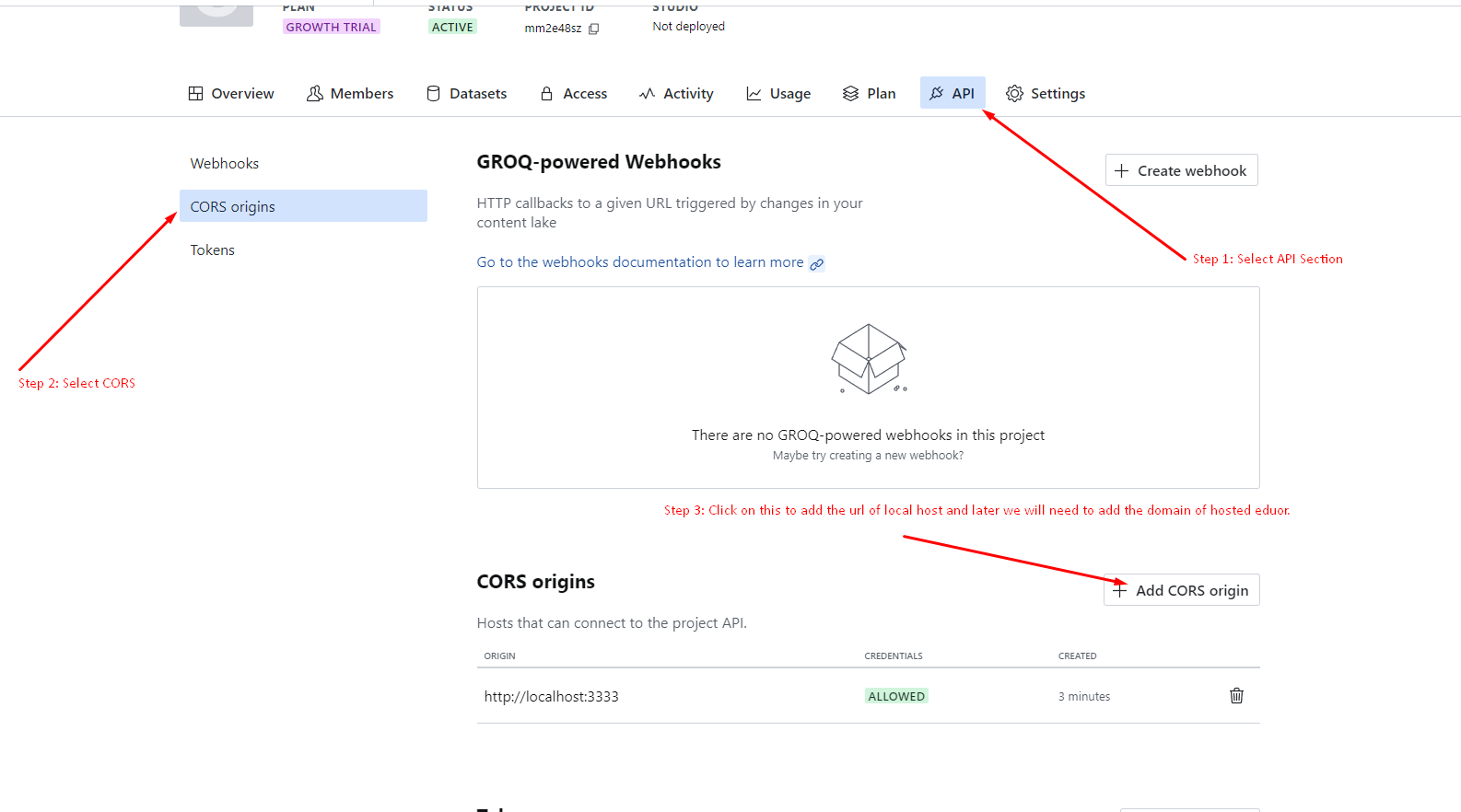 Select CORS origins section and add CORS origin of the localhost url. Most common localhost is http://localhost:3000/.
