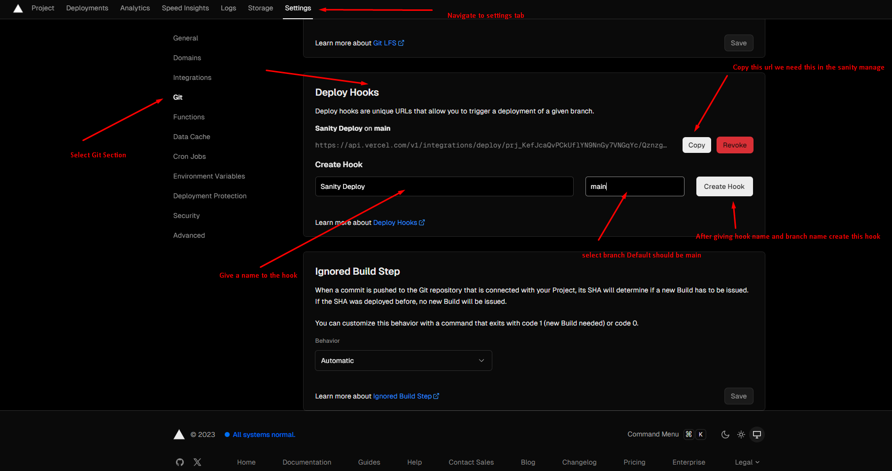 8. In deploy hook create hook by giving it name and branch name. After deploying the hook copy the url we will need that in sanity manage panel.